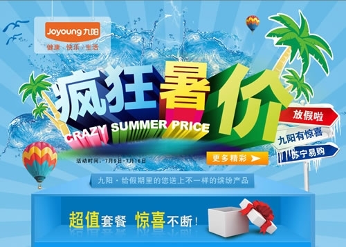 本次促销活动页面分为三个专区,分别为疯狂暑价之秒杀大赛、疯狂暑价之超值套餐、疯狂暑价之欢乐返不停专区。疯狂暑价之秒杀大赛专区的产品限量秒杀,秒完为止,九阳热销豆浆机、电饭煲、电磁炉单品惊爆价199元。活动一上线,立即吸引网友疯狂抢购。
