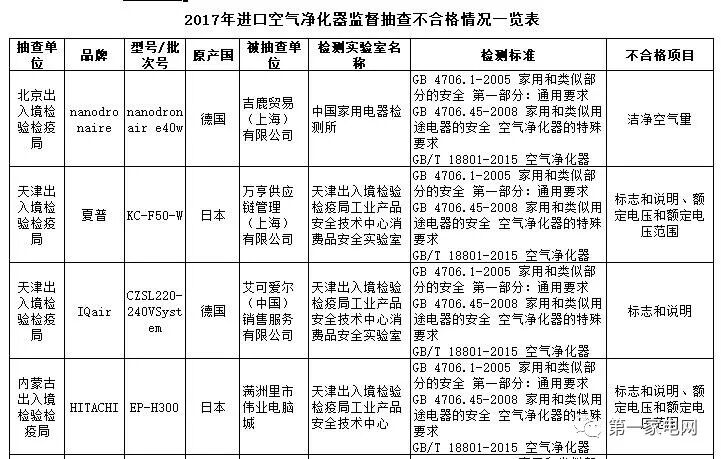 中国质量新闻网讯 据国家质检总局官网2018年1月30日消息,2017年4月至10月,质检总局组织全国出入境检验检疫机构对法定检验商品目录以外的进口商品实施了监督抽查。其中,抽查进口空气净化器73批,检出不合格28批,不合格检出率38.4%。