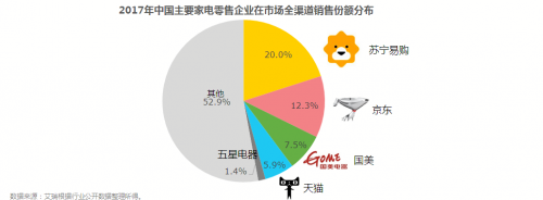 (口碑家电网-2018-04-08)据国内专业第三方研究机构艾瑞咨询最新发布的数据,2017年,中国全渠道家电销售规模达到7905亿,苏宁易购独占20%份额,领跑全渠道第一,京东以12.3%的份额位列第二位。