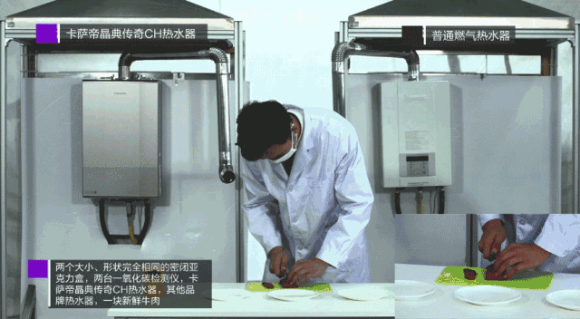 视频中,实验人员将卡萨帝晶典传奇CH热水器和其他品牌热水器的废气分别通入两个放有新鲜牛肉的密闭的装有一氧化碳报警装置的盒中,短短几秒钟,前者盒中的一氧化碳数值始终维持在个位数,而后者数值瞬间高达500ppm,随之警报大作。