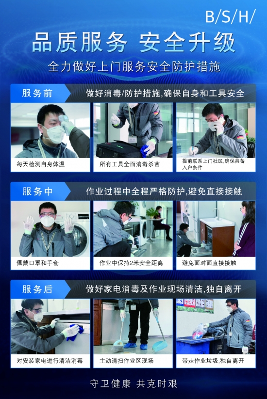 特殊时期,消费者需要专业的家电维修服务怎么办?上门服务是否会增加感染风险?面对消费者的需求和顾虑,博西家电认为若想让消费者更安心、更安全,首先要保证服务者的健康与安全。在疫情发生后博西家电迅速响应,不断完善上门服务流程并加强员工安全意识培训,为消费者全程畅享安全无忧的服务奠定了良好基础。博西家电的上门服务安全防护措施,全面保障了售后工程师与用户的健康安全:服务前,做好消毒、防护措施,确保自身和工具安全;作业过程中全程严格防护,与用户保持2米安全距离,避免直接接触;服务后,做好家电消毒及作业现场清洁,并及时带走作业垃圾。