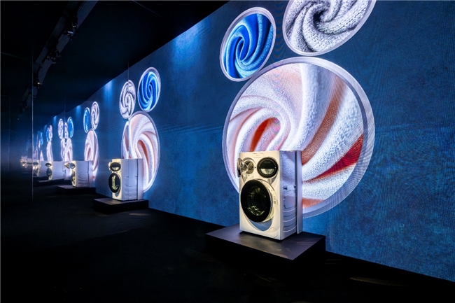 艺术展的另一核心亮点则是为直观展示即将上市的新品三筒洗衣机搭建的专属沉浸式体验空间。Candy借助LED动态视觉与音效联动技术,引导参观者踏上一段感官之旅,将Candy创新的理念转化为图像与声音,“三筒同时运转”的工作过程艺术化呈现,让观众直观理解分区洗护的运作原理与便捷性,展现科技与艺术完美融合的创新理念。