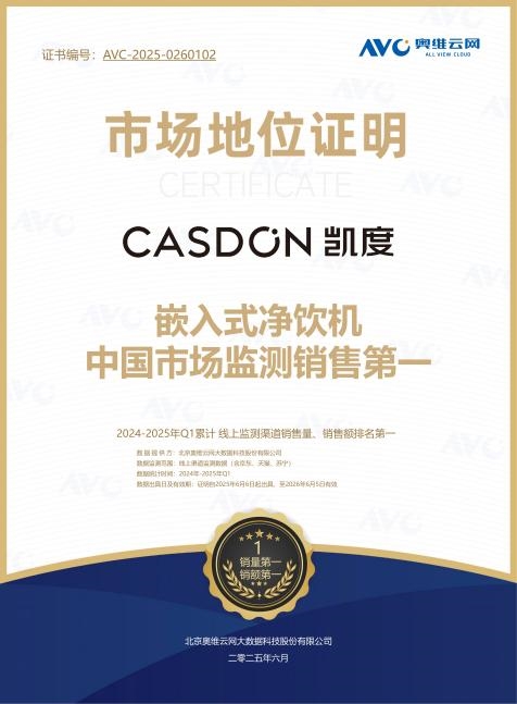 多品类协同发力,覆盖家庭厨居核心场景。据奥维云网数据,凯度嵌入式净饮机斩获2024-2025年Q1线上监测渠道销售量、销售额第一,客观体现市场认可度,其产品的绿色属性也契合当下消费者健康环保需求。