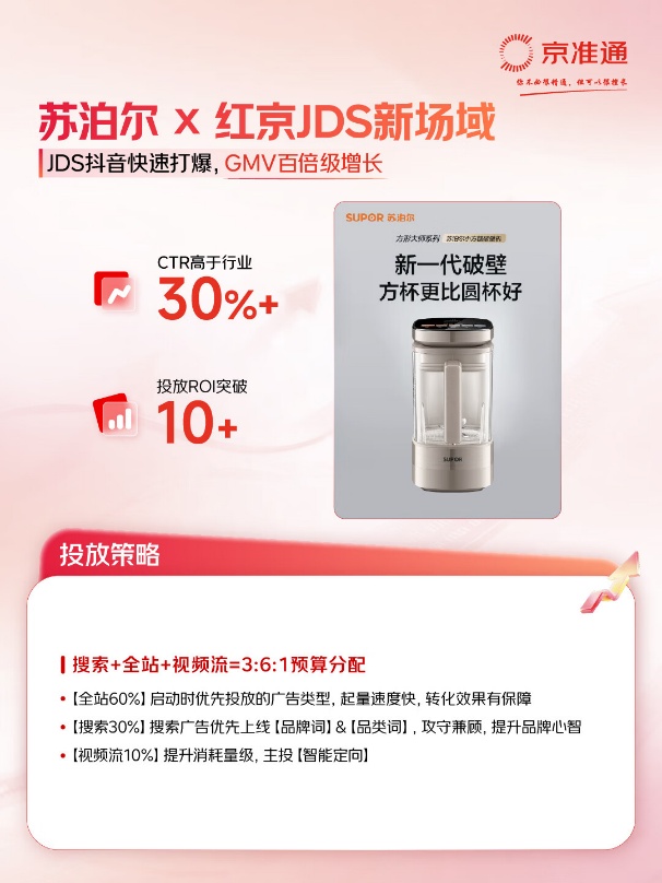 在厨房小家电品类,苏泊尔聚焦产品核心卖点开展内容营销,围绕用户决策链路统筹搜索、全站和视频等多元流量场景,在扩大品牌曝光的同时,也强化了品牌词、品类词等核心流量的承接效率。通过更有针对性的内容分发和预算配置,品牌持续优化触达效果与转化表现,最终实现CTR高于行业30%、投放ROI突破10的成绩。